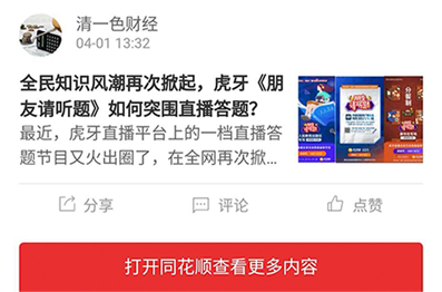 在流量红利的今天,直播答题以知识普及作为核心,创造了一种值得探索的直播商业模式,而虎牙《朋友请听题》的收官成绩,更加证明了直播答题模式新拐点来临,可以说,2020年重启后的直播答题,未来可期。