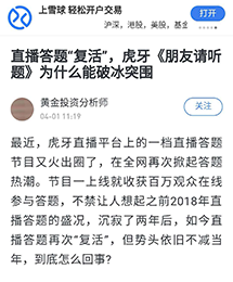 成功斩获巨大流量的《朋友请听题》可谓是重启了直播答题模式,再次掀起一轮“答题热”。可以说,《朋友请听题》创新了“直播+答题”的模式,让知识变现有了互联网时代的新尝试。